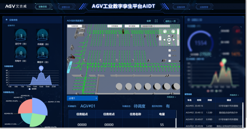 然而,小A的故事還沒有結束。基于艾吉威免費贈送的數字化工廠AIDT(艾吉威工業數字孿生)平臺,小A可以做一些維護保養的事項。該平臺可采集每輛小千斤的所有信息,包括故障、速度、電量、任務等,可實現對所有機器人產品的實時監控與故障排查,真正實現小千斤產品的遠程運維。
