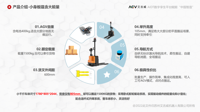 艾吉威機器人“小千斤”AGV,其設(shè)計特點手自一體多種模式,適用于物料多、載具不統(tǒng)一、配送作業(yè)繁忙、廠區(qū)面積大、配送距離遠(yuǎn)、物料員作業(yè)方式不統(tǒng)一的制造型企業(yè)。數(shù)字化大平臺免費贈送,應(yīng)用不斷免費升級,更加符合當(dāng)下“數(shù)實融合”、“智改數(shù)轉(zhuǎn)”的發(fā)展大勢。“小千斤”寓意千斤重?fù)?dān)小意思,大平臺寓意大數(shù)據(jù)平臺支撐,應(yīng)用功能免費統(tǒng)一升級。