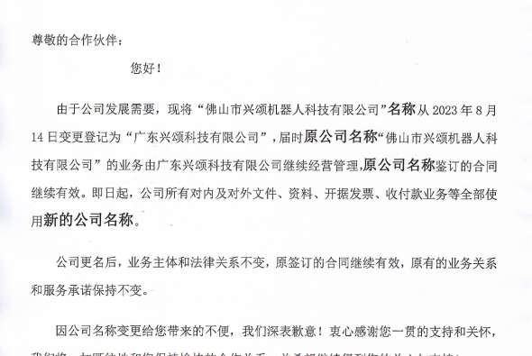 因企業發展需要,2023年8月14日我司名稱由佛山市興頌機器人科技有限公司變更為廣東興頌科技有限公司。在2023年8月14日前,由...