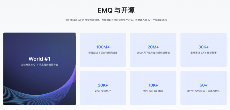 結合多年來服務企業(yè)數(shù)字化轉型的實踐經(jīng)驗和全球領先開源先進理念,EMQ 在開源社區(qū)治理、開源實踐和商業(yè)化等領域均獲得了不錯的成效。EMQ 發(fā)起并維護的開源項目——物聯(lián)網(wǎng)消息服務器 EMQX,在同類型開源項目中排名全球第一,全球下載量已超 2000 萬次,連接了超過 1 億臺的物聯(lián)網(wǎng)設備,每月全球活躍集群部署超過 3 萬個。