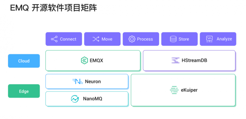 在邊緣端,EMQ 開發(fā)了工業(yè)協(xié)議解析轉換的工業(yè)網(wǎng)關軟件 Neuron,它可以一站式接入各種各樣的工業(yè)協(xié)議,將其轉換成標準的物聯(lián)網(wǎng) MQTT 協(xié)議,實現(xiàn)繁雜工業(yè)設備的接入;用于物聯(lián)網(wǎng)邊緣計算的超輕量級 MQTT 消息服務中間件軟件 NanoMQ;還有一款是目前托管在 Linux 基金會下面的 eKuiper 項目,主要用來實現(xiàn)邊緣的流式數(shù)據(jù)處理。