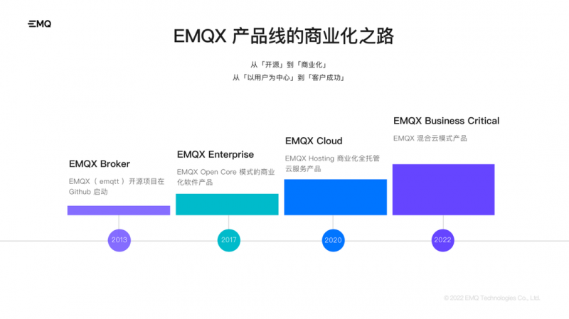 EMQ PMM 王凡分享了 EMQX 產(chǎn)品線的商業(yè)化模式探索。EMQX 從 2013 年在 Github 開源社區(qū)中啟動,經(jīng)過了相當長的一段時間的產(chǎn)品打磨和市場驗證,直到 2017 年才開始啟動第一個真正商業(yè)化的私有部署產(chǎn)品 EMQX Enterprise。2020 年開始嘗試將 EMQX 全托管在公有云的服務上。從 2020-2022 年的兩年時間,EMQX 產(chǎn)品活躍度、用戶增長數(shù)都有了相當大的飛躍。