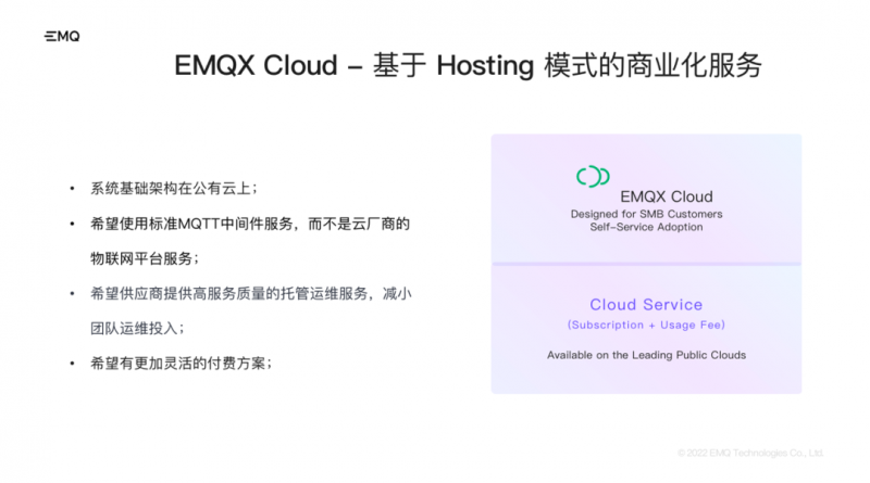 EMQ 也向客戶提供了云服務 EMQX Cloud,為客戶提供全托管的物聯(lián)網(wǎng)消息接入,可以支持主流的公有云提供商,用戶只需要一鍵點擊,就可以創(chuàng)建出面向生產(chǎn)級別的高可用高安全的服務。