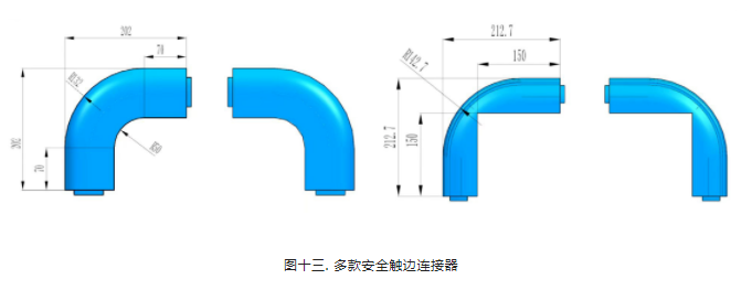 同時(shí)為了和客戶移動(dòng)部件更好地配合組裝安全觸邊,沃美諾一次性開發(fā)了多款口型安全觸邊連接器(用的比較多的兩款口型見圖十二);以配合內(nèi)圓角分類,可分為直角連接器,R50連接器及R80連接器(見圖十三)。當(dāng)這三種連接器都無法達(dá)到客戶的完美要求時(shí),沃美諾還可根據(jù)客戶提供的安全觸邊安裝區(qū)域數(shù)據(jù)進(jìn)行個(gè)性化定制。