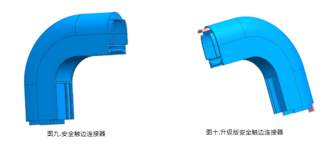 同時(shí)安全觸邊連接器由原來的整個(gè)轉(zhuǎn)角盲區(qū)(連接器中間無法穿入導(dǎo)電條,見圖九)提升到了現(xiàn)在的升級(jí)版安全觸邊連接器(見圖十);升級(jí)后的安全觸邊完全消除盲區(qū)的也將兩側(cè)導(dǎo)電條連接了起來,同時(shí)也提升了整體外觀的美觀度。