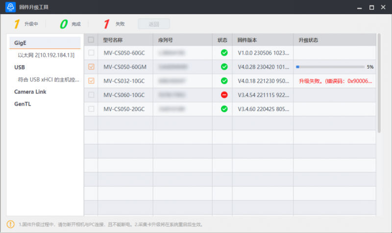 工具可批量升級多個相機或采集卡固件,最多可同時勾選20個相機或采集卡。