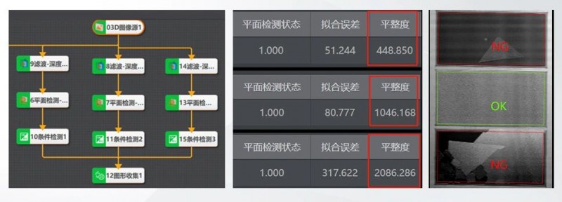 針對(duì)疊片和碎片缺陷檢測(cè),VM 3D軟件中,深度圖像分別定位到每個(gè)硅片位置,統(tǒng)計(jì)每個(gè)硅片位置ROI內(nèi)平面度,根據(jù)平面度情況判斷硅片是否存在破碎和疊片。
