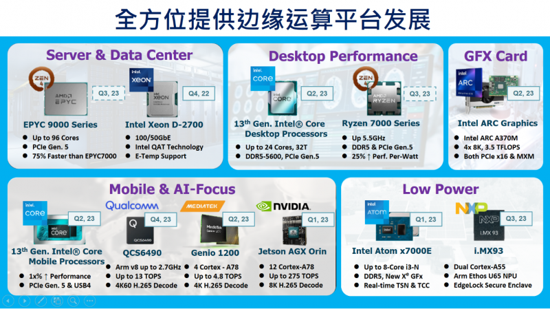 張家豪認為目前邊緣運算有兩大發(fā)展方向:第一是往高效能發(fā)展,強調(diào)High performance computing(HPEC);第二是往Edge AI發(fā)展,研華在Embedded Design-in的核心競爭力除了積累多年的實戰(zhàn)經(jīng)驗之外,還可為客戶提供一系列的R&D服務(wù)、技術(shù)設(shè)計服務(wù),包括軟件和硬件。相比傳統(tǒng)的嵌入式計算,研華看到了從低功耗、標準通用型平臺到邊緣運算的轉(zhuǎn)變。因此,研華非常重視產(chǎn)品的高效能發(fā)展,特別是在HPEC架構(gòu)下。此外,研華也看到了AI技術(shù)對于邊緣運算產(chǎn)業(yè)和嵌入式電腦產(chǎn)業(yè)的趨勢,因此他們正在努力將AI技術(shù)導(dǎo)入,形成Edge AI平臺。