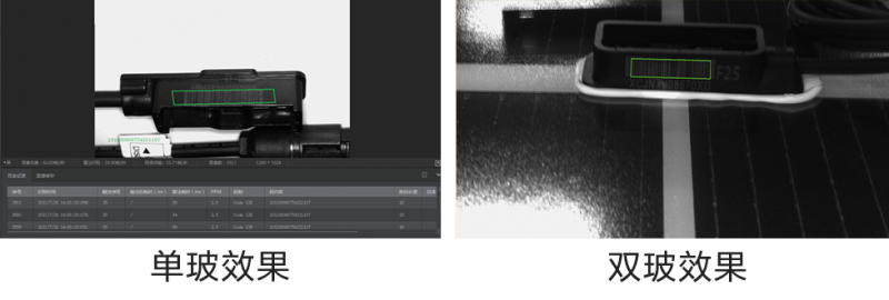 需求:電池片敷設(shè)背板或背玻后,表面會(huì)貼附標(biāo)簽碼用于后續(xù)工序的追溯管理,單玻組件貼在背板上,雙玻組件貼在毛玻璃上,需要在組件運(yùn)轉(zhuǎn)過程中讀碼。