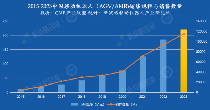 根據新戰略移動機器人產業研究所初步測算,預計2023年中國移動機器人(AGV/AMR)銷售規模約為220億,同比增長18.9%;銷售數量約為115000臺,同比增長23.7%。