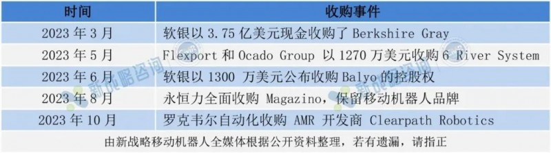 除融資以外,2023年移動機器人收購事件也值得關注。據(jù)公開資料顯示,收購事件5起,總收購金額超4億美元(超28億人民幣),最高金額達3.75億美元,其中,軟銀兩度出手,累計斥資近4億美元收購兩家企業(yè)。