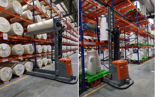 該智能物流項(xiàng)目是振德醫(yī)療在許昌的第5個(gè)生產(chǎn)基地,該基地建設(shè)規(guī)模1000余畝,建筑面積達(dá)43萬平方米,基地園區(qū)內(nèi)物流路線縱橫交錯(cuò),路線長(zhǎng)、產(chǎn)品線多、產(chǎn)品切換頻繁,應(yīng)用場(chǎng)景復(fù)雜、從事物流搬運(yùn)、存儲(chǔ)、分揀、配送在冊(cè)員工近300人。振德醫(yī)療的項(xiàng)目產(chǎn)品種類多、批量小,特別是一些定制化的產(chǎn)品(公司成品、半成品、原材料代碼超4萬個(gè)),生產(chǎn)線對(duì)于物料搬運(yùn)要求高效、準(zhǔn)確。特別原料形狀、大小存在很大差異,環(huán)境要求不同,需要不同類型車輛相互交叉作業(yè),來滿足生產(chǎn)需求。該項(xiàng)目共投入使用59臺(tái)今天國(guó)際定制化AGV,包括三類38臺(tái)激光導(dǎo)航叉車AGV和21臺(tái)二維碼導(dǎo)航的潛伏頂升式AGV,59臺(tái)AGV共同運(yùn)行在同一個(gè)車間里,協(xié)同工作,互不干擾。AGV系統(tǒng)在不同車型的車輛管理上實(shí)現(xiàn)了完美融合,真正做到了智慧物流。AGV應(yīng)用場(chǎng)景包括原料、蛋糕卷、成品無人化、智能化精準(zhǔn)搬運(yùn),實(shí)現(xiàn)了在高層貨架的上下架自動(dòng)搬運(yùn)、平面?zhèn)}庫(kù)的自動(dòng)搬運(yùn)、以及半成品到使用車間的自動(dòng)配送。