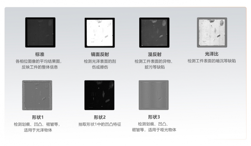 傳統檢測方案往往需要針對不同缺陷定制專用設備,不僅成本高昂,而且標準化程度低。而2.5D視覺技術則大為不同,它僅需單個光源就能同時檢測多種類型的缺陷,且不受角度限制,這大大提升了方案的通用性和效率。更重要的是,一次拍攝就能輸出多類型的結果圖,從細小的凹凸到復雜的劃痕,再到微小的臟污,展現了強大的復合檢測功能。