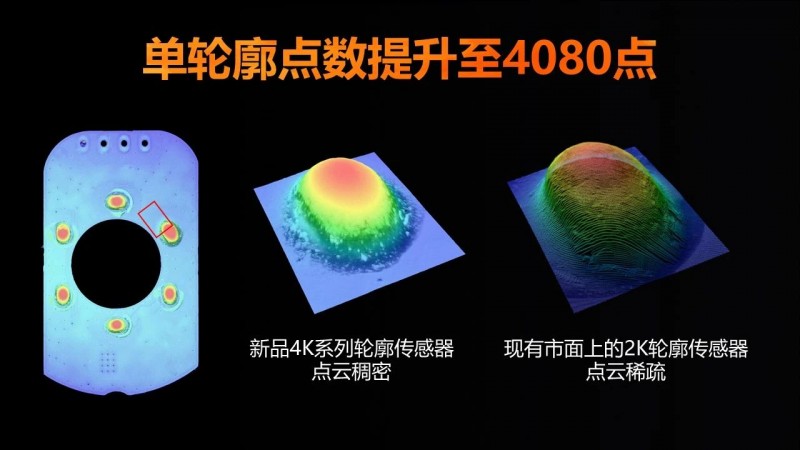 新一代3D激光輪廓傳感器的單輪廓點數提升至4080點,相比2K分辨率產品,在相同測量范圍下的X軸分辨率提升接近2倍,使輪廓傳感器能夠更好地捕捉復雜表面特征,如凹陷、突起和反光表面。通過FPGA硬件加速,最高掃描幀率提升至49KHz,使相機能更好地滿足現代高速生產線的需求,確保在高速度下仍能保持高精度的測量,為高精度、高速率測量的檢測場景提供更高效的解決方案。