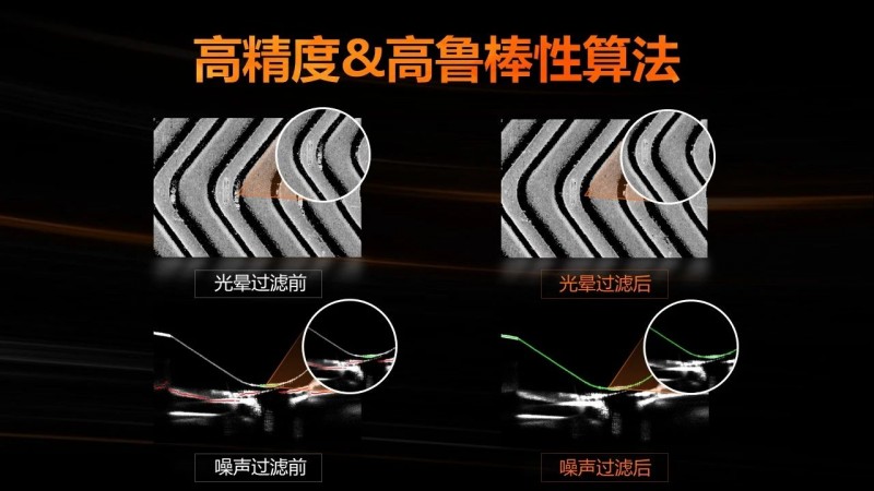 新一代3D激光輪廓傳感器內置全面升級的視覺算法,超高亞像素算法精度可達1/16像素。多幀圖像融合技術使輪廓數據提取更加完整,光暈過濾和連續性濾除可以有效降低反光干擾的影響,提升算法在不同應用場景下的魯棒性。