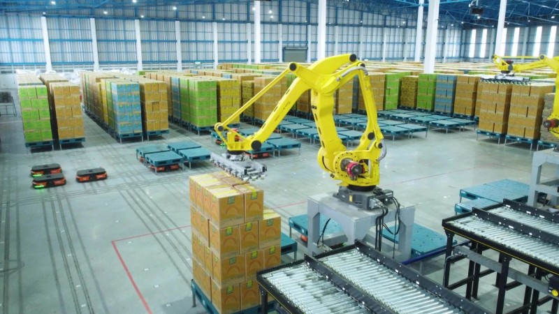 海康機器人AMR與人工作業團隊、現有機械臂設備協同作業,無縫對接,每天接收500個托盤,整體入庫效率大幅提升。