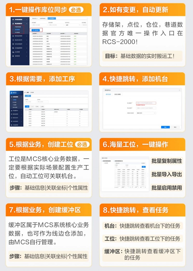 MCS可一鍵實(shí)現(xiàn)庫(kù)位同步,如有變更可以自動(dòng)更新。用戶可根據(jù)需要,portant="" style="margin: 0px; padding: 0px; border: 0px; outline: 0px; vertical-align: baseline; background: transparent;">靈活添加工序、快捷跳轉(zhuǎn)并添加機(jī)臺(tái)。工位是MCS的核心業(yè)務(wù)數(shù)據(jù),自動(dòng)工位可關(guān)聯(lián)機(jī)臺(tái),實(shí)現(xiàn)海量工位一鍵操作,包括批量復(fù)制屬性、導(dǎo)入導(dǎo)出、啟用禁用等功能。也支持根據(jù)業(yè)務(wù)需求創(chuàng)建緩沖區(qū)、快速跳轉(zhuǎn)并查看任務(wù)。最后實(shí)現(xiàn)物料、載具與庫(kù)位之間的靈活綁定。