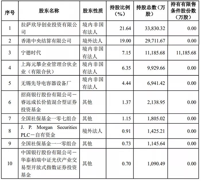 近期,先導智能發布向特定對象發行股票發行情況報告書,截至2021年6月10日,先導智能此次發行股票總數量為111,856,823股,發行價格為22.35元/股,實際募集資金總額約人民幣25億元,扣除發行費用(不含稅)后,實際募集資金凈額約人民幣24.88億元。此次發行股份的對象為寧德時代,此次發行后公司前十名股東情況如下表,寧德時代位列前十大股東。