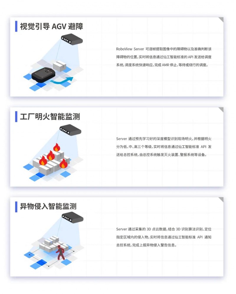 RoboView Server 通過(guò)攝像頭實(shí)時(shí)采集的現(xiàn)場(chǎng)視頻,經(jīng)過(guò)不同的視覺(jué)算法判斷現(xiàn)場(chǎng)情況,實(shí)時(shí) 通過(guò)仙工智能標(biāo)準(zhǔn) API 發(fā)送給對(duì)應(yīng)的調(diào)度系統(tǒng)或總控系統(tǒng),以確保工作、生產(chǎn)安全進(jìn)行。