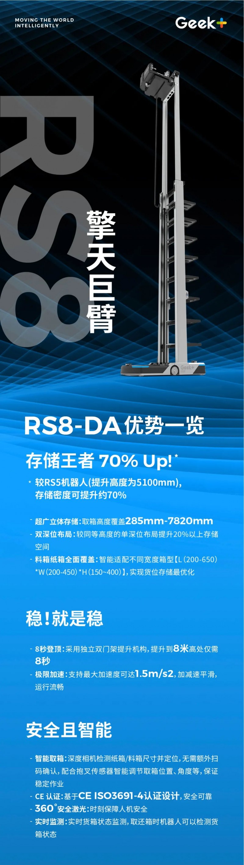 全球AMR引領(lǐng)者極智嘉(Geek+)今日重磅發(fā)布一款最大提升高度達(dá)8145mm的全新貨箱機(jī)器人RS8,刷新業(yè)內(nèi)貨箱機(jī)器人高度極限!該機(jī)器人取箱高度范圍覆蓋從285mm至7820mm,實(shí)現(xiàn)超廣立體存儲。相比RS5機(jī)器人(提升高度為5100mm),RS8的存儲密度可提升約70%,再創(chuàng)貨箱到人高密度存儲天花板。