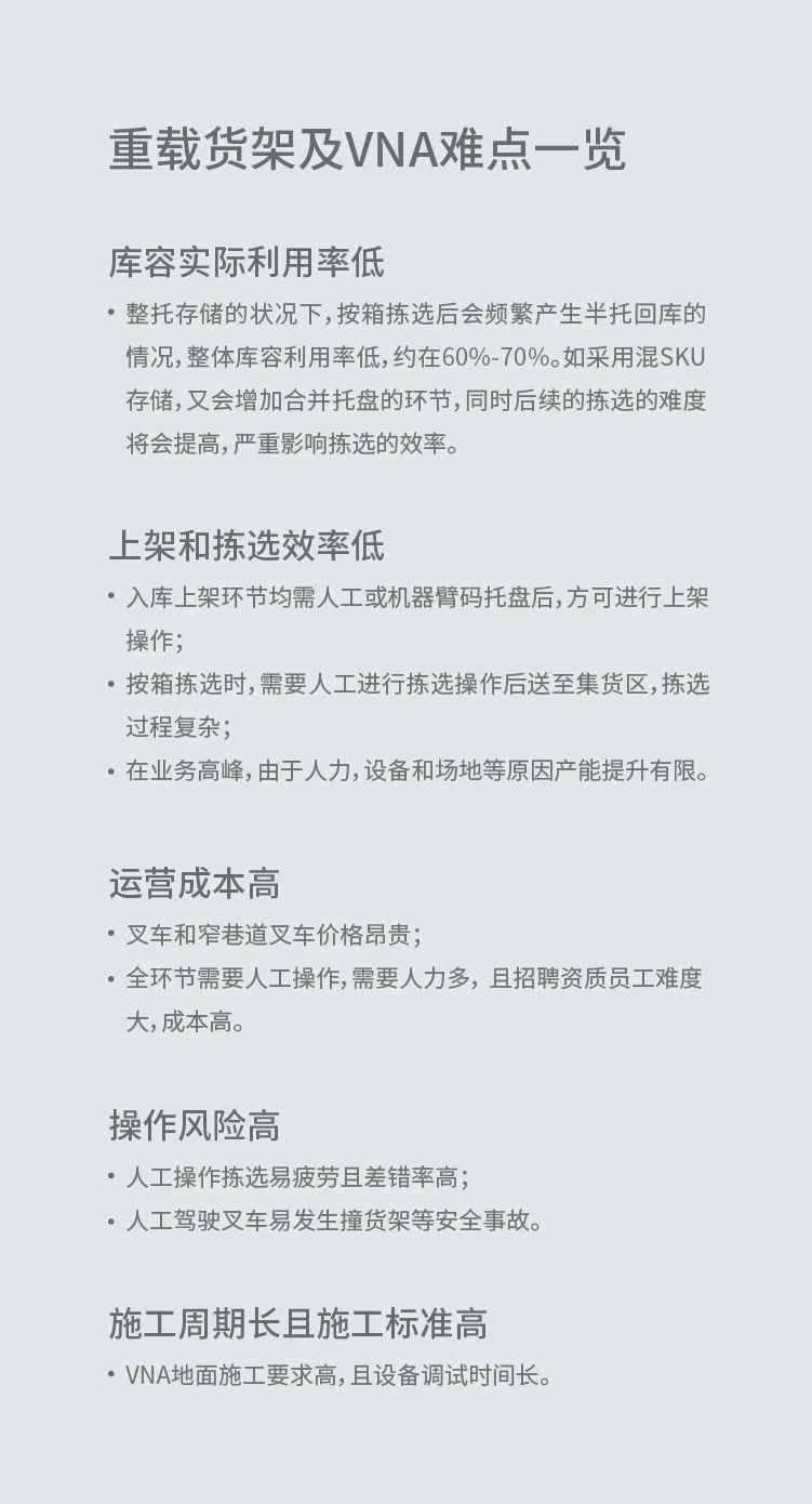 RS8-DA貨箱機(jī)器人主打服裝行業(yè)整箱存取場景,目前,該場景大多采用重載貨架配合人工叉車進(jìn)行揀選,而這種形式多面臨以下難點(diǎn):