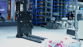 在國自展臺我們還看到一臺叉式機器人在展示平庫堆疊功能,機器人將兩疊壘放著較大體積的礦泉水托盤精準地堆疊,給到場觀眾帶去較為直觀的感受。
