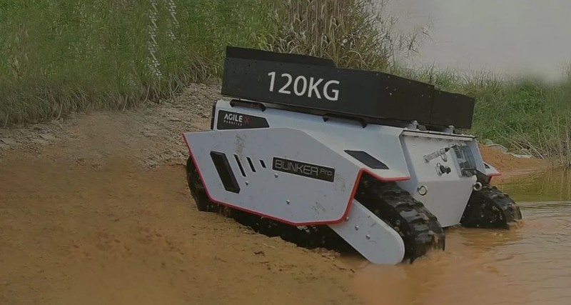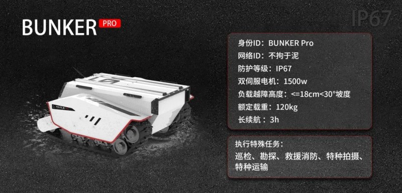 可以說,BUNKER Pro提供了在野外、箱涵、石泥路等高挑戰(zhàn)性環(huán)境下最佳的移動開發(fā)平臺,助力機(jī)器人行業(yè)和科研客戶快速部署和開發(fā)特殊作業(yè)機(jī)器人,諸如巡檢、勘探、消防、特種拍攝、特種運(yùn)輸?shù)葢?yīng)用。BUNKER Pro外觀結(jié)構(gòu)全新設(shè)計,車身重心位置低,裝置了1500W雙伺服電機(jī)進(jìn)行驅(qū)動,極具越野性。此外,其采用了克里斯蒂懸掛和瑪?shù)贍栠_(dá)四輪平衡多懸掛系統(tǒng)組合,并于全車安裝了加強(qiáng)版避震器和防撞擊結(jié)構(gòu)組件,外觀采用了高強(qiáng)度和大厚度的鋼材,這為執(zhí)行特種作業(yè)應(yīng)用提供了可靠的減震系統(tǒng)性能。 目前,BUNKER Pro最高越障可達(dá)18cm,爬坡度為<=30°,這意味著面對野外坡道和廠區(qū)樓梯,BUNKER Pro都可以一舉輕松爬越和穩(wěn)定運(yùn)行。BUNKER Pro驅(qū)動形式為履帶差速轉(zhuǎn)向和左右獨(dú)立驅(qū)動,自研運(yùn)動控制系統(tǒng)電機(jī)采用了2500線光電增量式碼盤,可以在復(fù)雜道路中實(shí)現(xiàn)高精度的控制,并且可以柔性實(shí)現(xiàn)0轉(zhuǎn)彎半徑原地自旋。BUNKER Pro外觀配置了防撞耐用的鋼質(zhì)結(jié)構(gòu), 且整車結(jié)構(gòu)、材料以及外置電氣元件均采用均采用高防護(hù)等級設(shè)計,達(dá)到了IP67安全標(biāo)準(zhǔn),這是市面上同級別綜合路況移動平臺中防護(hù)等級最高的。其具備沙塵滲透防護(hù)、移動涉水和短暫浸泡防護(hù)(防浸)等優(yōu)勢,無懼任何潮濕、涉水、越野等極限工作環(huán)境,可以保證BUNER Pro極大拓展機(jī)器人的使用場景。基于高等級防護(hù)、模塊化和精簡部件結(jié)構(gòu)設(shè)計,BUNKER Pro車體后期清潔也是十分便捷的,不藏污垢,不易腐蝕,易于維護(hù)。標(biāo)準(zhǔn)二次開發(fā)拓展應(yīng)用BUNKER Pro平臺空間大,可以在原地自旋過程中達(dá)到120kg載重,這意味著可以輕松搭載各類檢測設(shè)備。用戶可通過CAN總線協(xié)議與主控通訊,快速接入傳感系統(tǒng),搭建自主應(yīng)用開發(fā)平臺,同時,BUNKER Pro也支持定制高級操作模式(遠(yuǎn)程駕駛/自動駕駛),提供開源SDK、ROS_PACKAGE。BUNKER Pro還具有大電池容量,可在常規(guī)路面載重120kg運(yùn)行情況下支持3小時續(xù)航, 也可對搭載的傳感器等外部設(shè)備進(jìn)行供電, 為機(jī)器人應(yīng)用的作業(yè)提供充足和便捷的運(yùn)行保障。