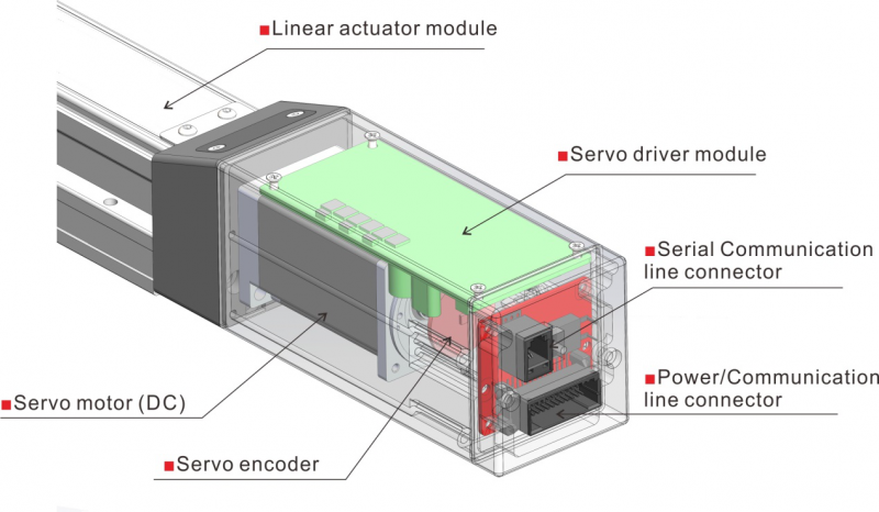 傳統模組的構成:①模組底座+②直線導軌+③滾珠絲杠+④伺服電機+⑤伺服驅動器 + PLC(外部控制器)