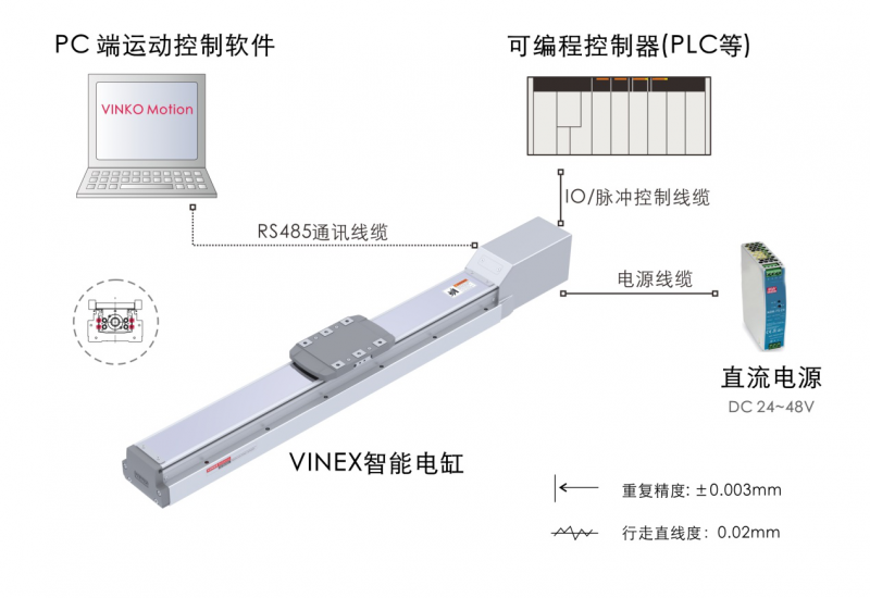 Vinex S系列為點位脈沖型電缸??杉嫒軵IO定位模式,脈沖模式和485通訊模式。Vinex Q系列為總線型電缸,可通過EtherCAT總線,實現與PLC的通訊控制,實現多軸聯機和總線控制。