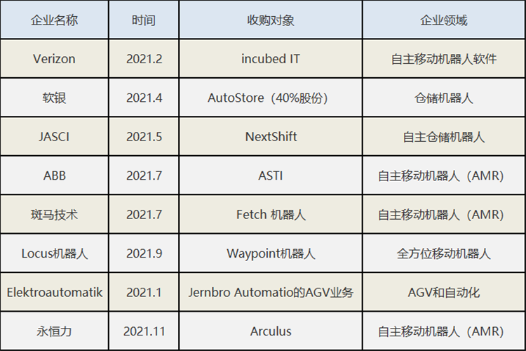 在整個(gè)移動(dòng)機(jī)器人行業(yè)向好的同時(shí),國外市場也同樣熱火朝天。據(jù)新戰(zhàn)略移動(dòng)機(jī)器人全媒體不完全統(tǒng)計(jì),為了更好地布局移動(dòng)機(jī)器人市場,國外移動(dòng)機(jī)器人行業(yè)今年掀起一陣“收購”浪潮,其中不乏知名企業(yè),如ABB、斑馬技術(shù)和永恒力等等。