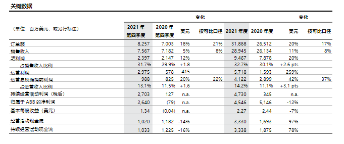 根據ABB發布的2021年第四季度及全年財報顯示,2021年全年,ABB訂單總額為319億美元,同比增長20%,按可比口徑增長17%;銷售收入為289億美元,同比增長11%,按可比口徑增長8%;運營利潤為57.18美元,利潤率為19.8%。
