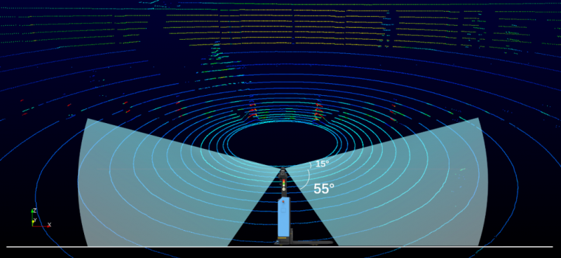 注:部署于仙工智能自動叉車的 RS-Helios 垂直視場角示意圖與室外實時三維成像點云