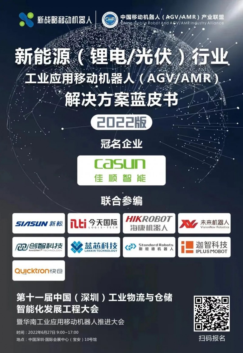 為了更好地解讀新能源行業(yè)移動(dòng)機(jī)器人應(yīng)用現(xiàn)狀及趨勢(shì),6月27日,由中國(guó)移動(dòng)機(jī)器人(AGV/AMR)產(chǎn)業(yè)聯(lián)盟、新戰(zhàn)略移動(dòng)機(jī)器人產(chǎn)業(yè)研究所主編的《新能源行業(yè)用移動(dòng)機(jī)器人(AGV/AMR)解決方案藍(lán)皮書(shū)(2022版)》將在“中國(guó)(深圳)工業(yè)物流與倉(cāng)儲(chǔ)智能化發(fā)展工程大會(huì)暨華南工業(yè)應(yīng)用移動(dòng)機(jī)器人推進(jìn)大會(huì)”上正式發(fā)布!